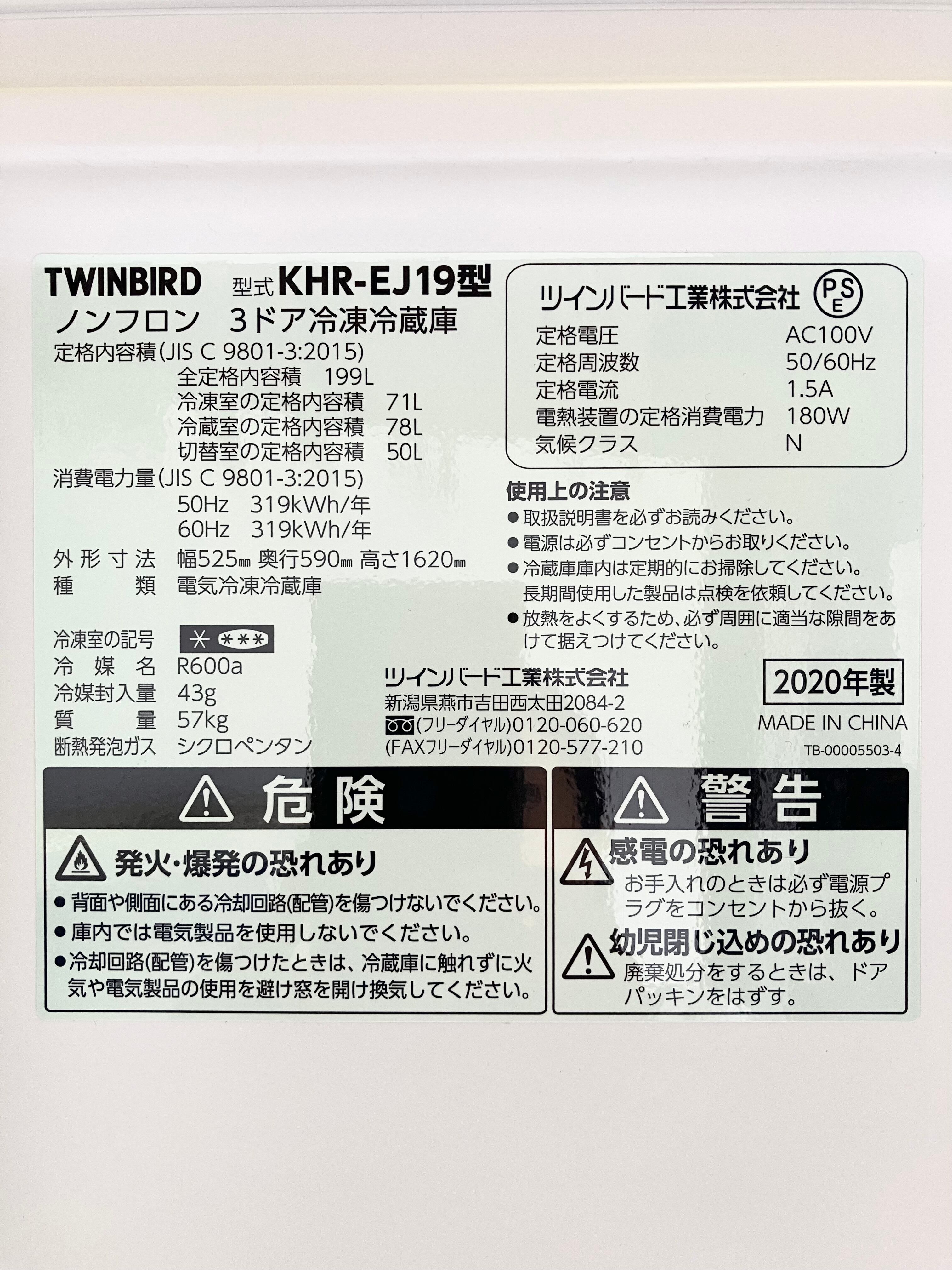 2020年製 TWINBIRD 199L ノンフロン冷凍冷蔵庫