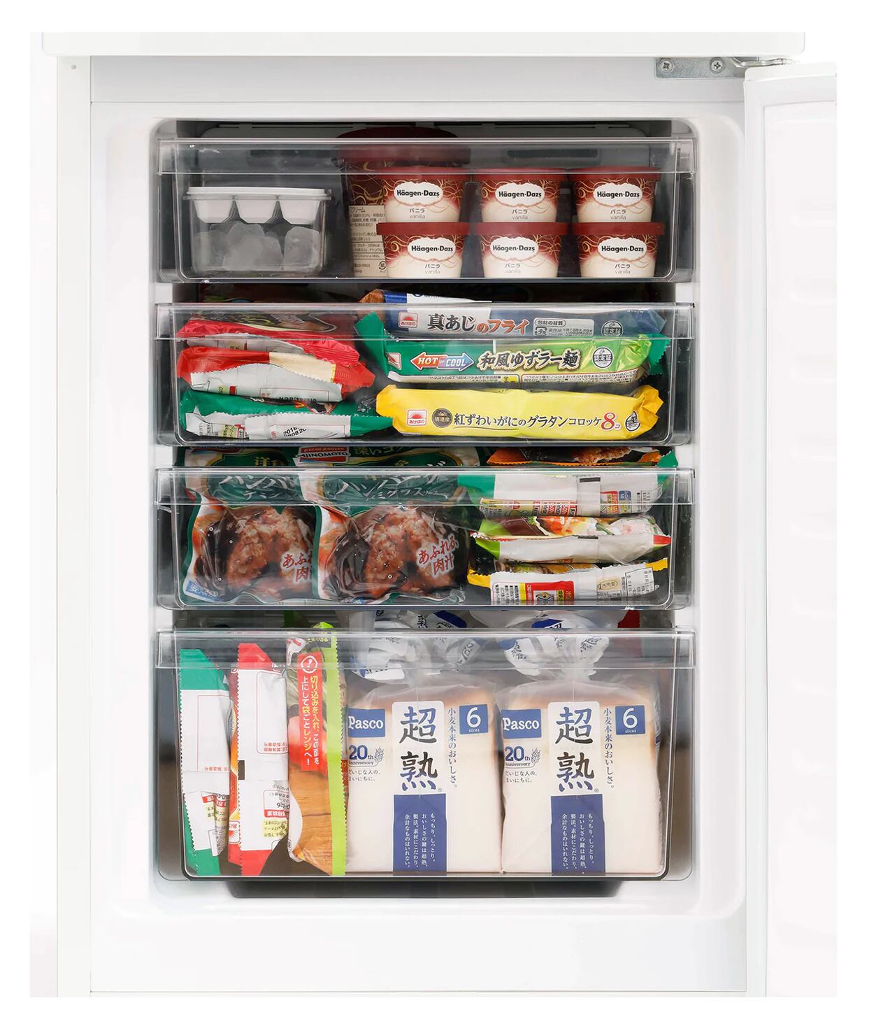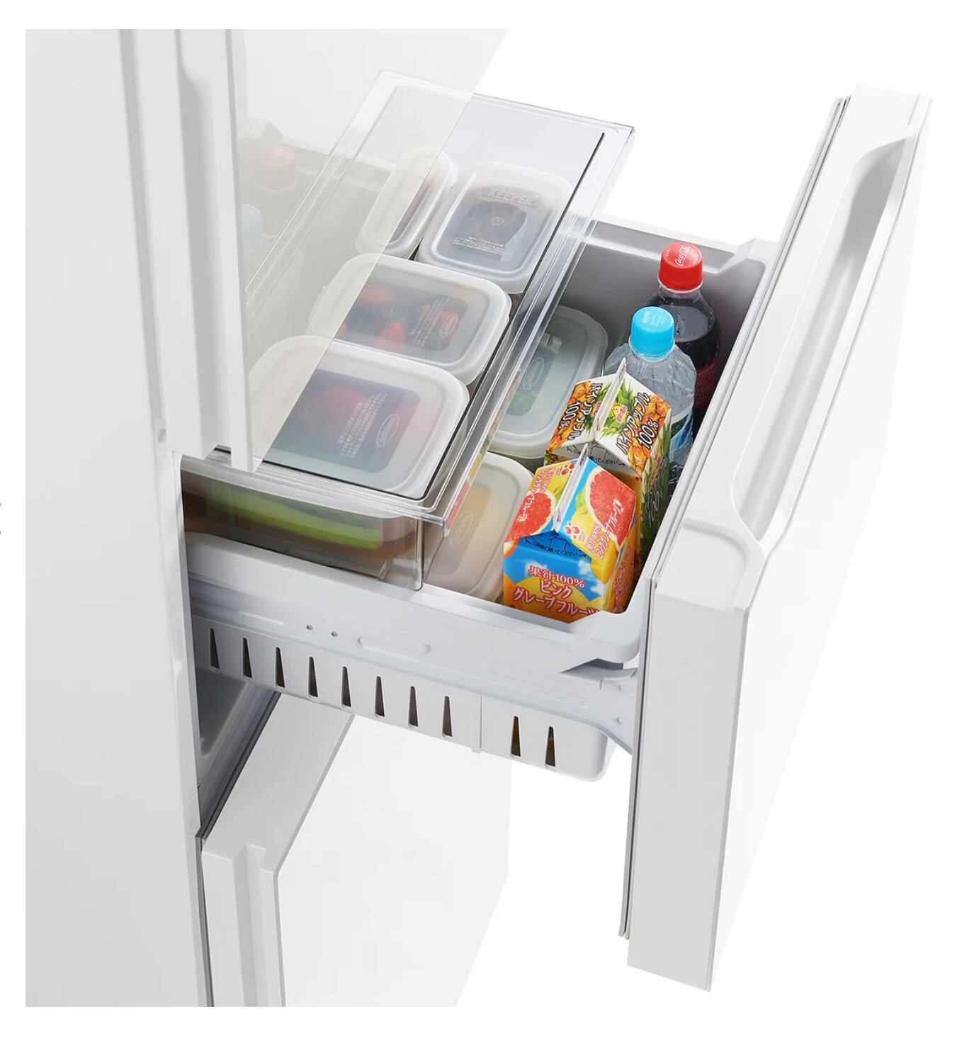大容量冷凍室と野菜室や冷蔵庫、ドリンク冷却室にもなる「くらしにピタッと切替室」を搭載☆