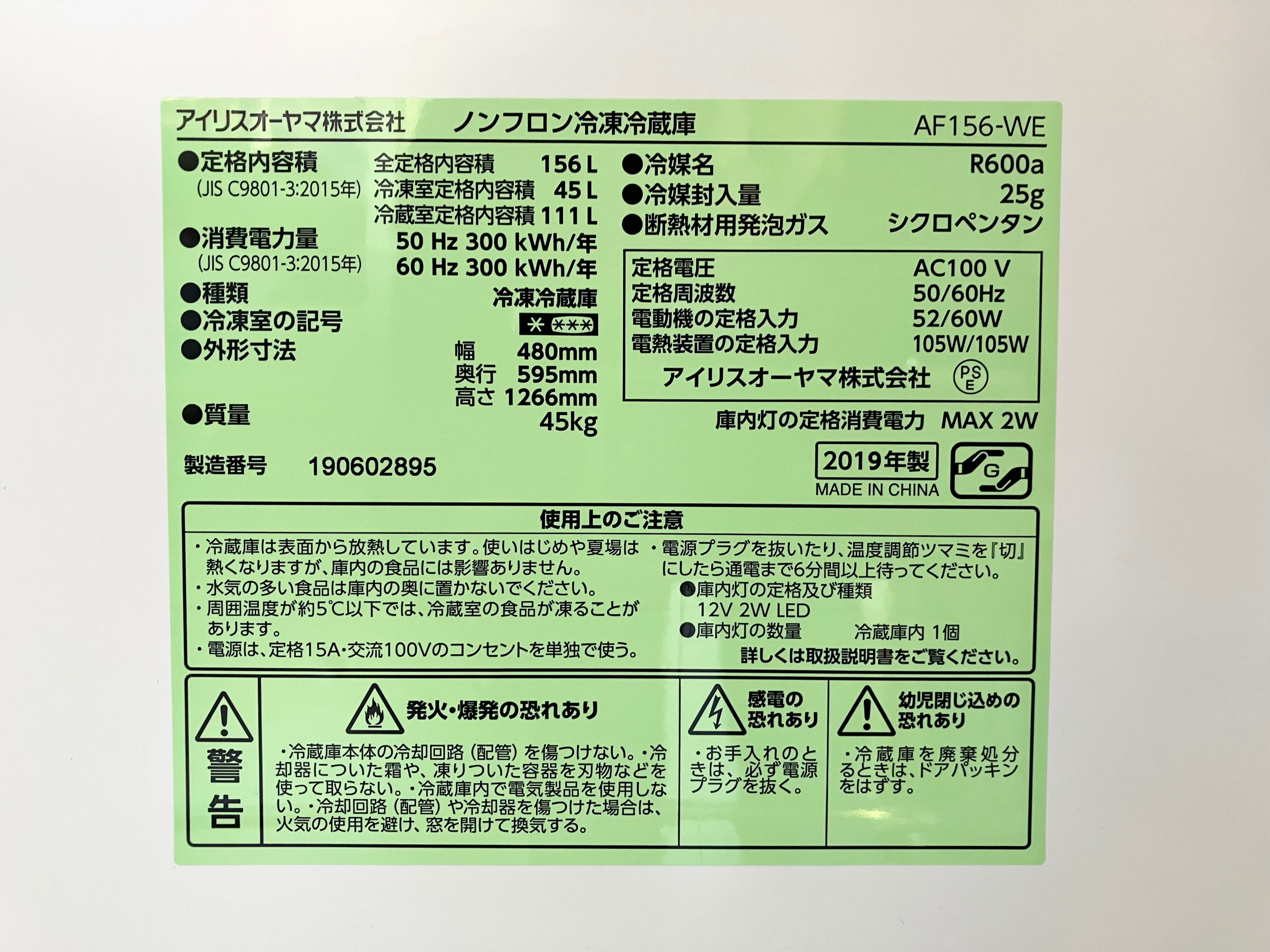 2019年製 IRIS 156L ノンフロン冷凍冷蔵庫