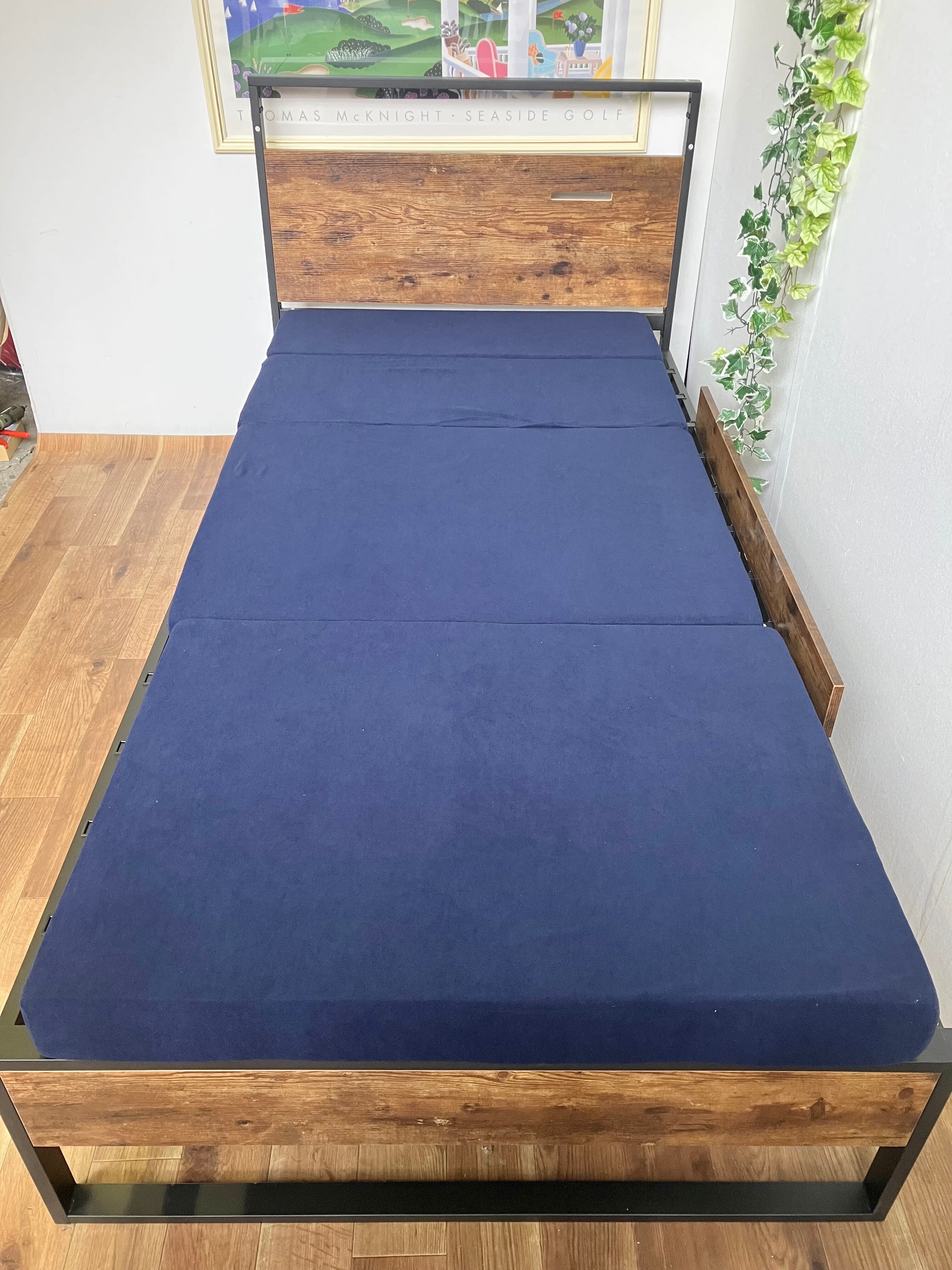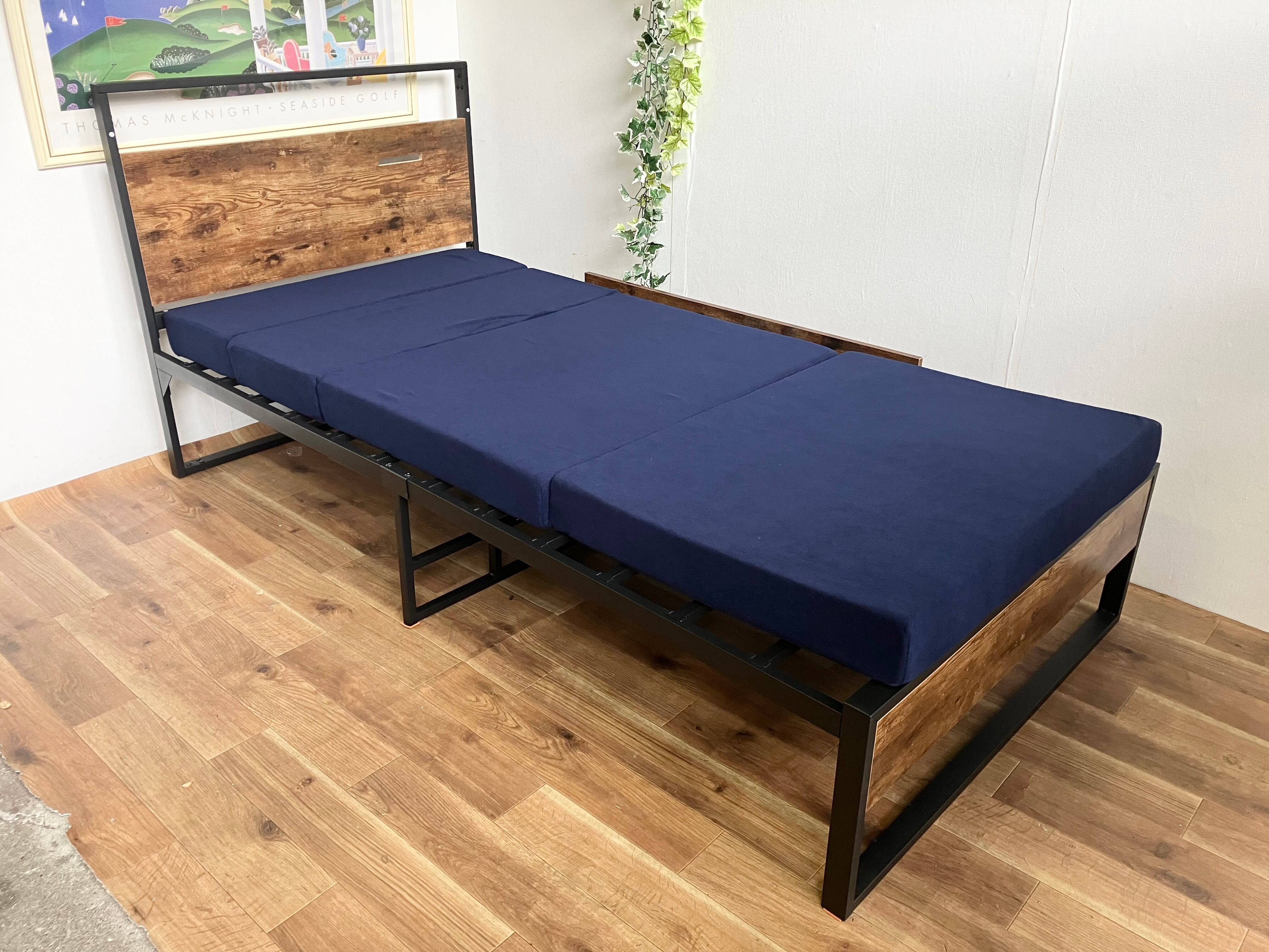 スチールフレームに折りたたみのマットレスがセットになったシングルベッドです。