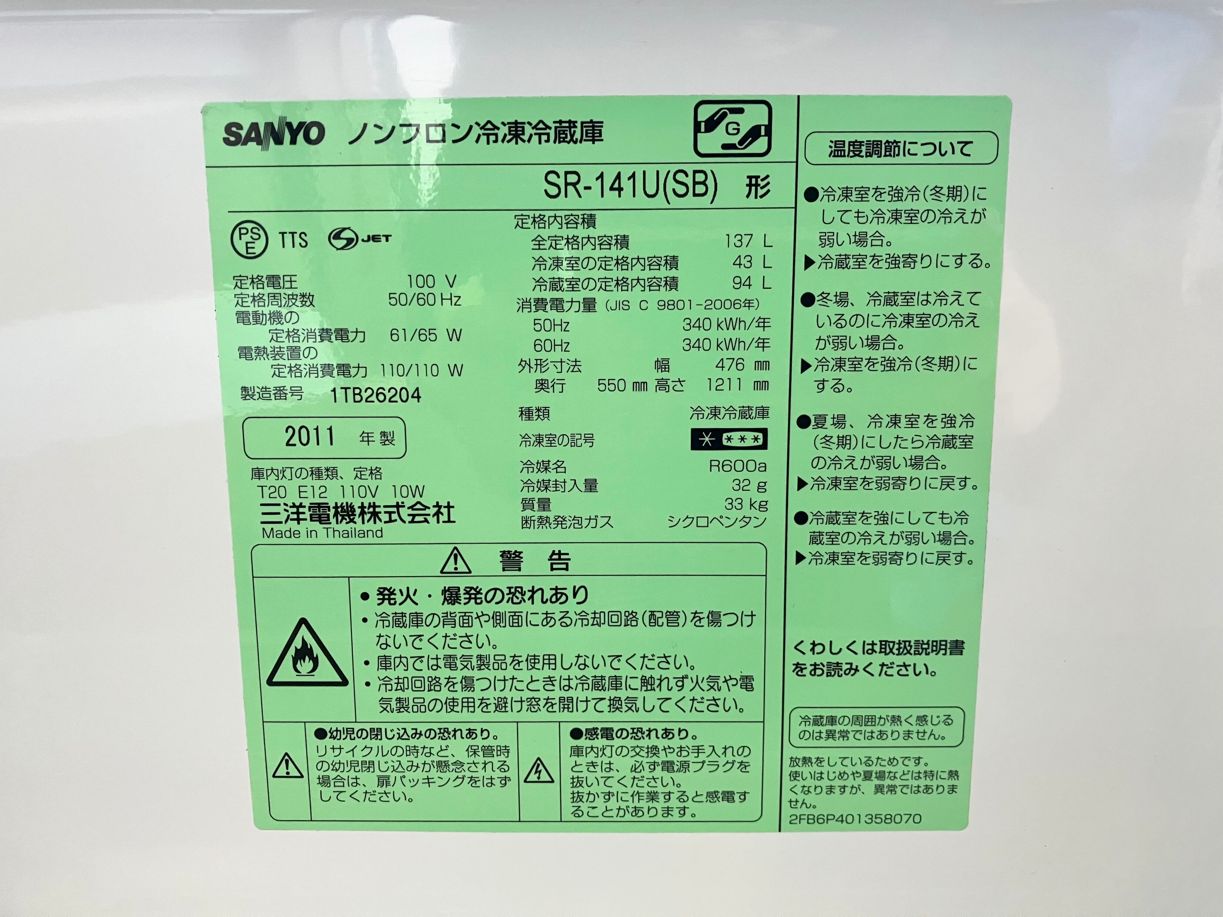 SANYO 137L ノンフロン冷凍冷蔵庫