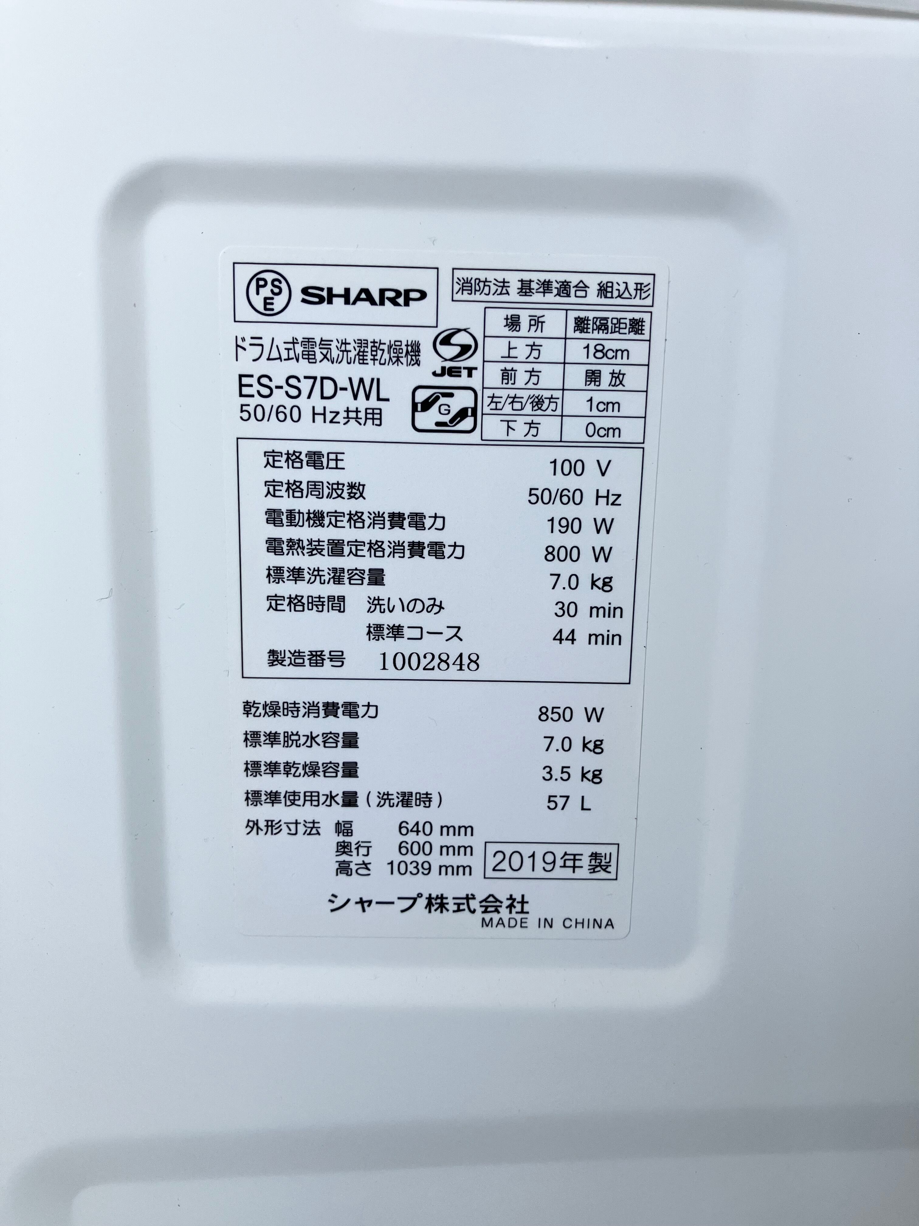 2019年製 7.0kg SHARP ドラム式洗濯機乾燥機