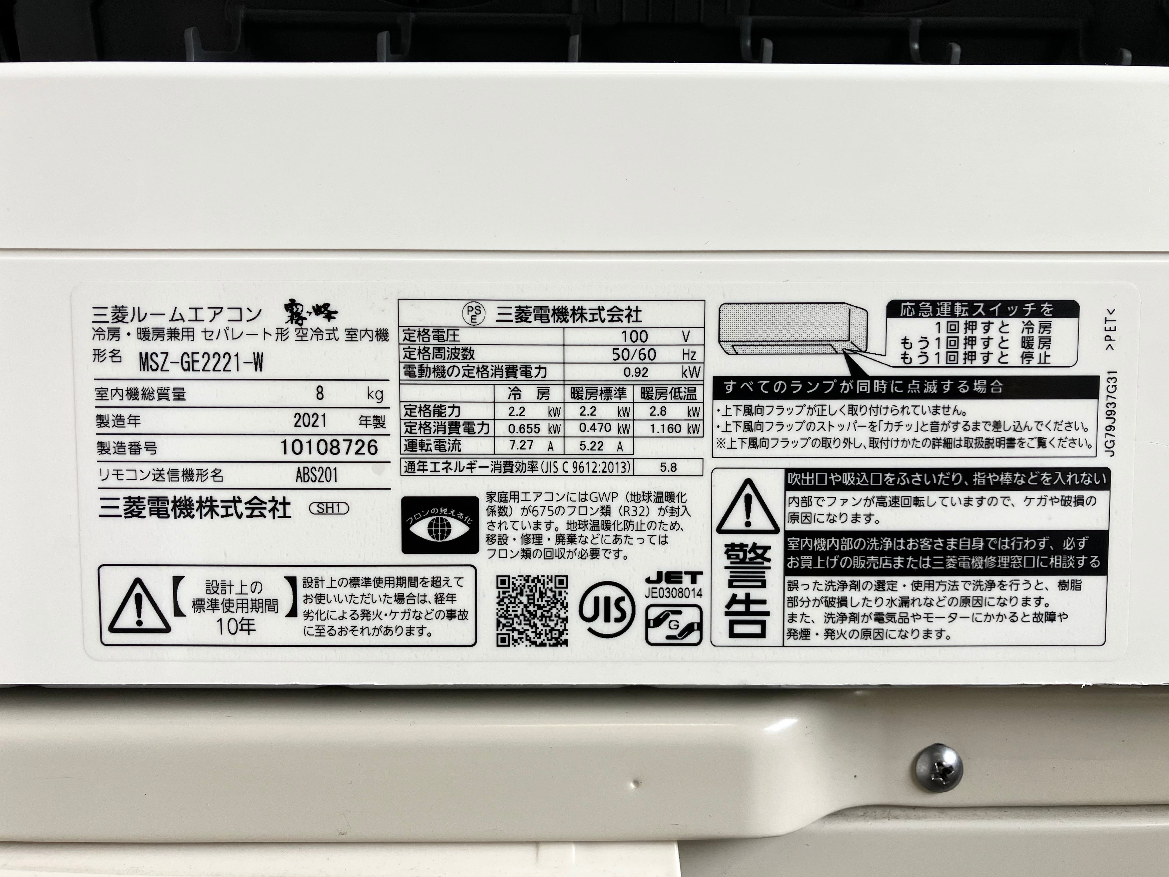 2.2kw-8畳 2021年製 MITSUBISHI ルームエアコン