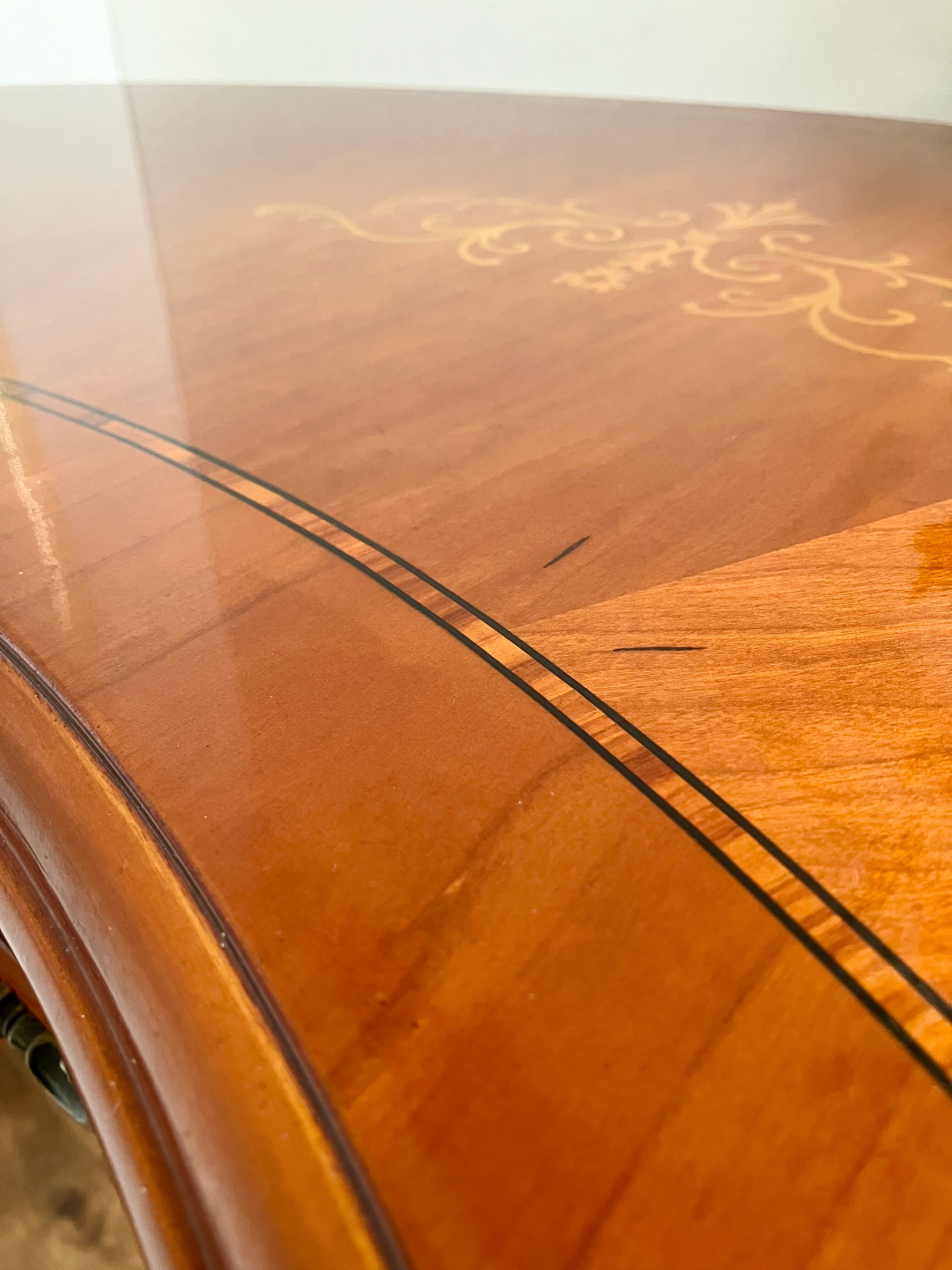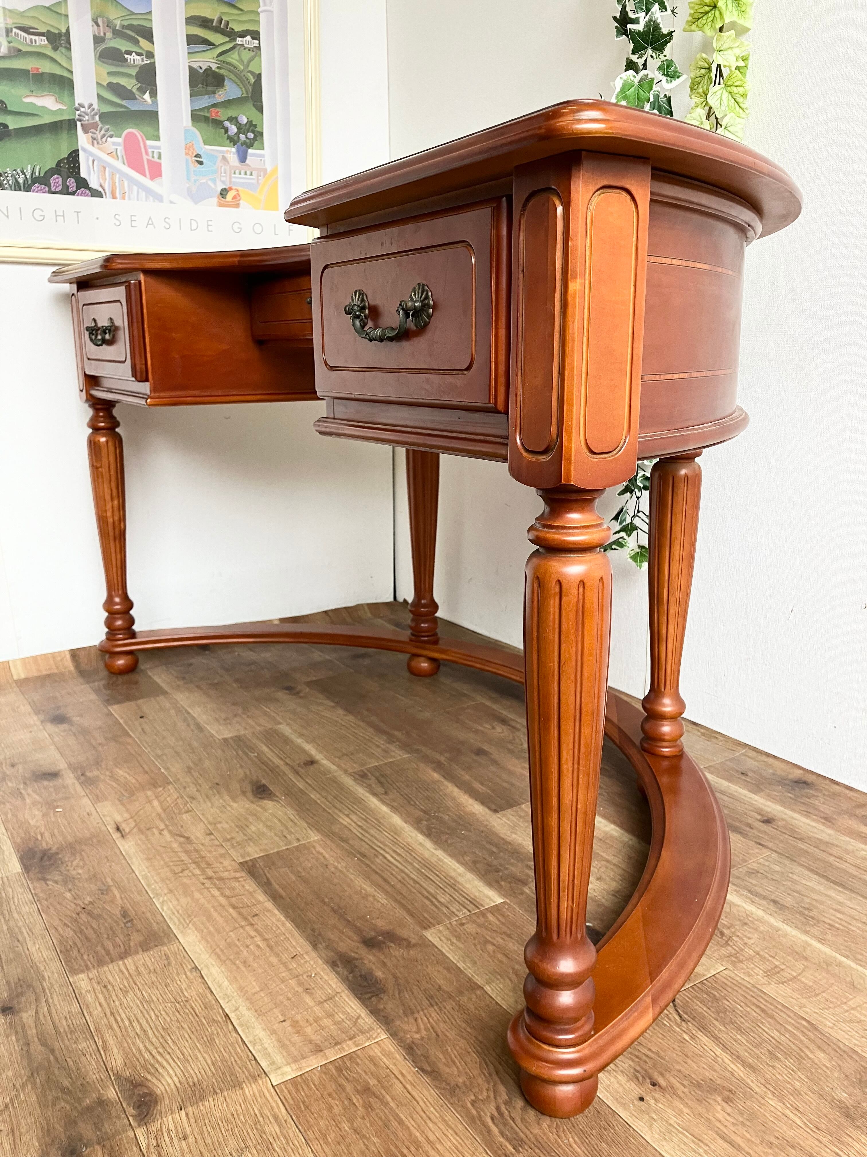 デスク天板には象嵌が施されいてとても美しいです。半円型という珍しい形も特徴的です◎