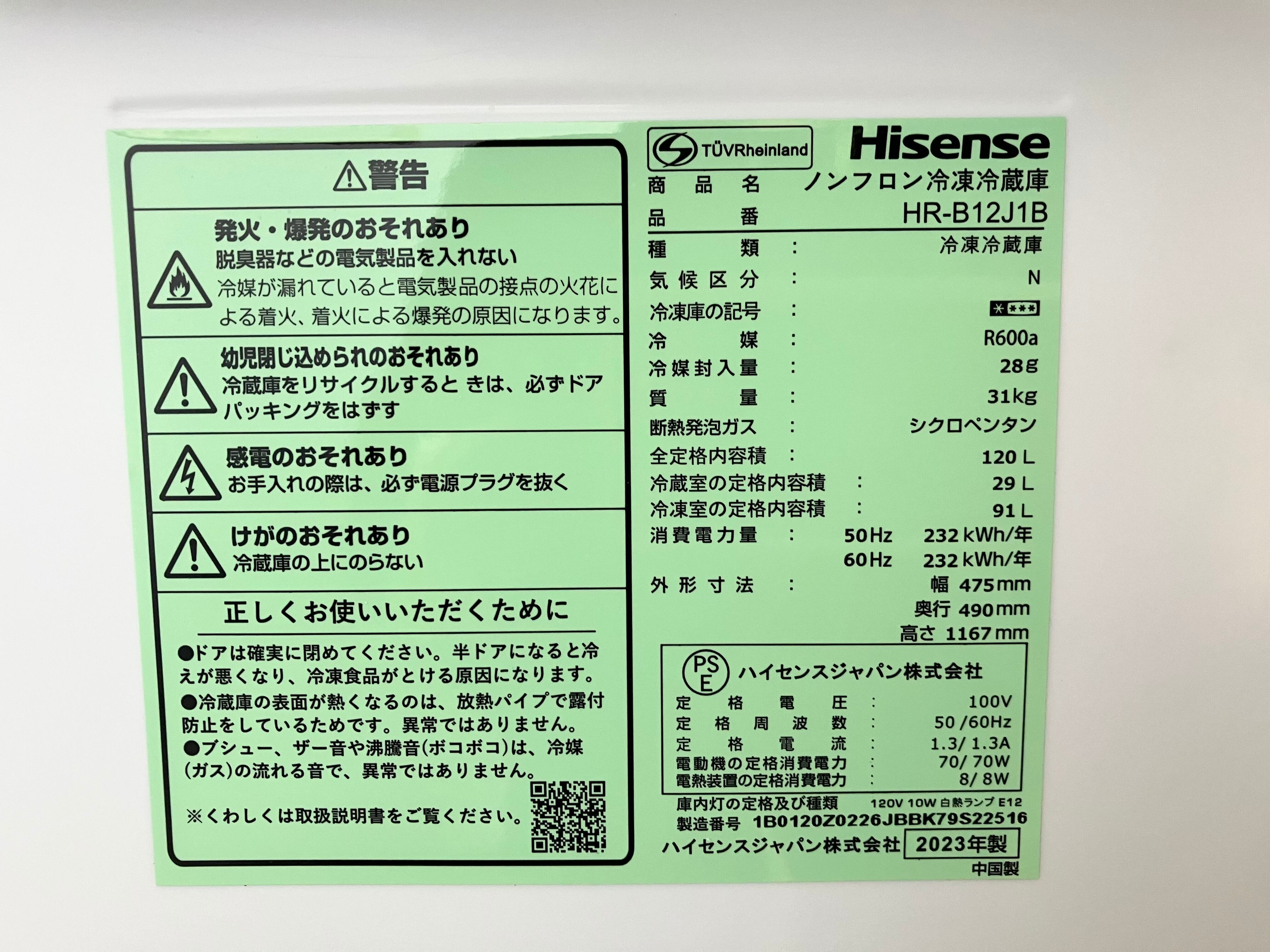 2023年製 Hisense 120L ノンフロン冷凍冷蔵庫