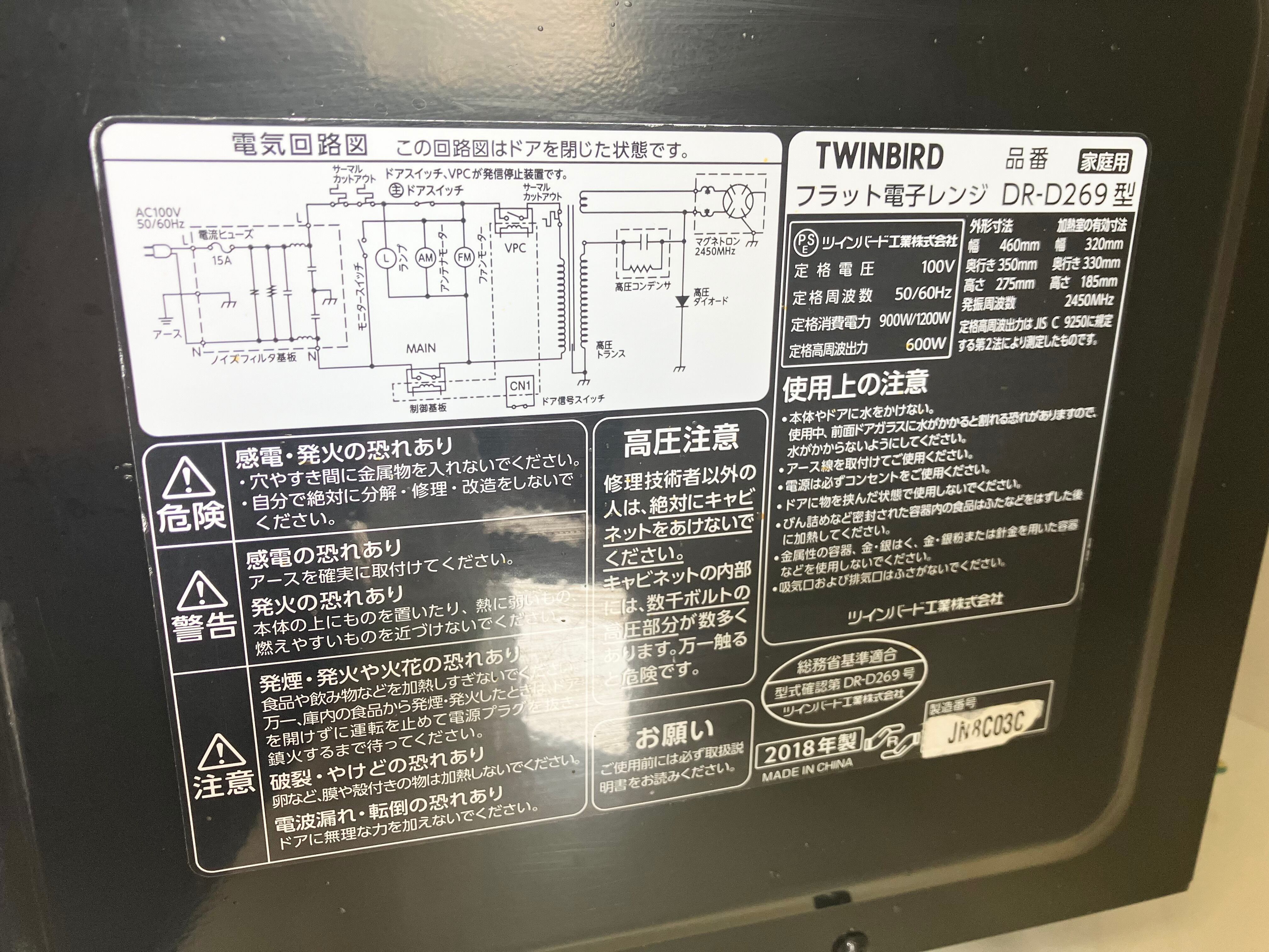 2018年製 TWINBIRD フラット電子レンジ