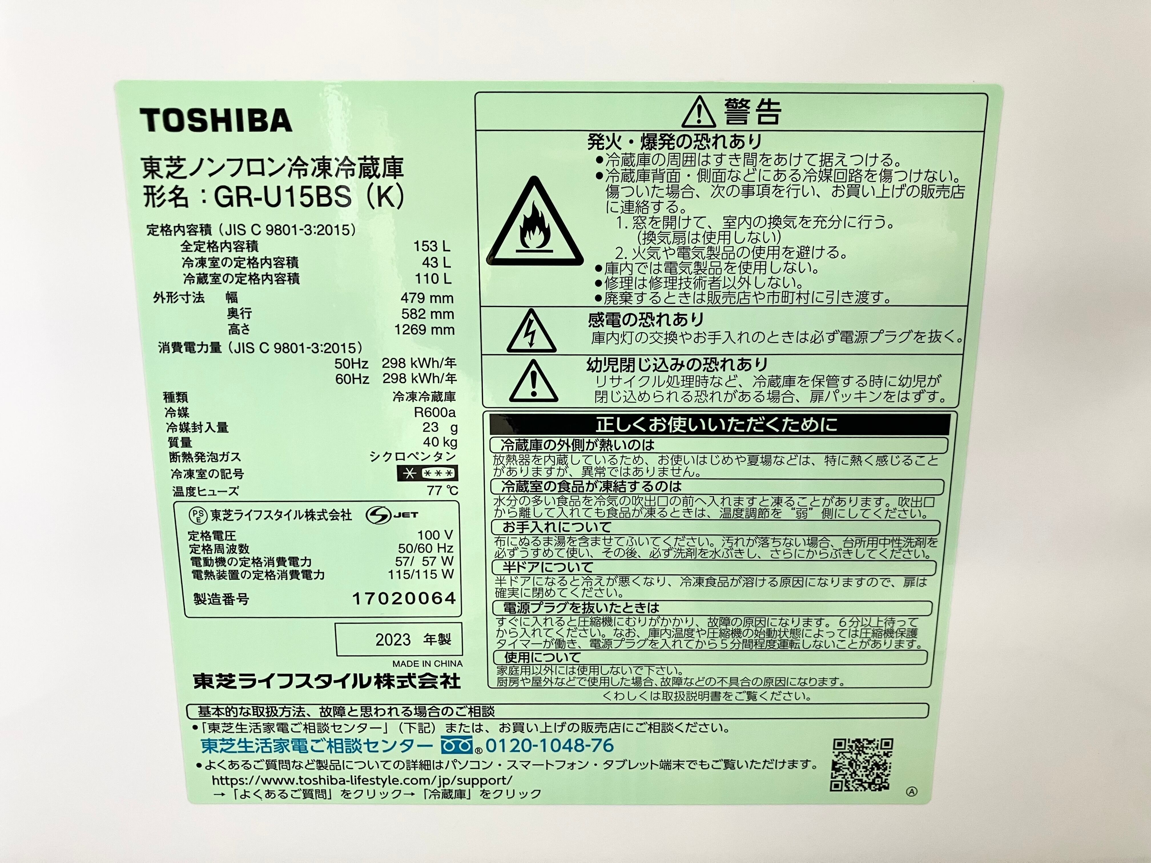 2023年製 TOSHIBA 153L ノンフロン冷凍冷蔵庫