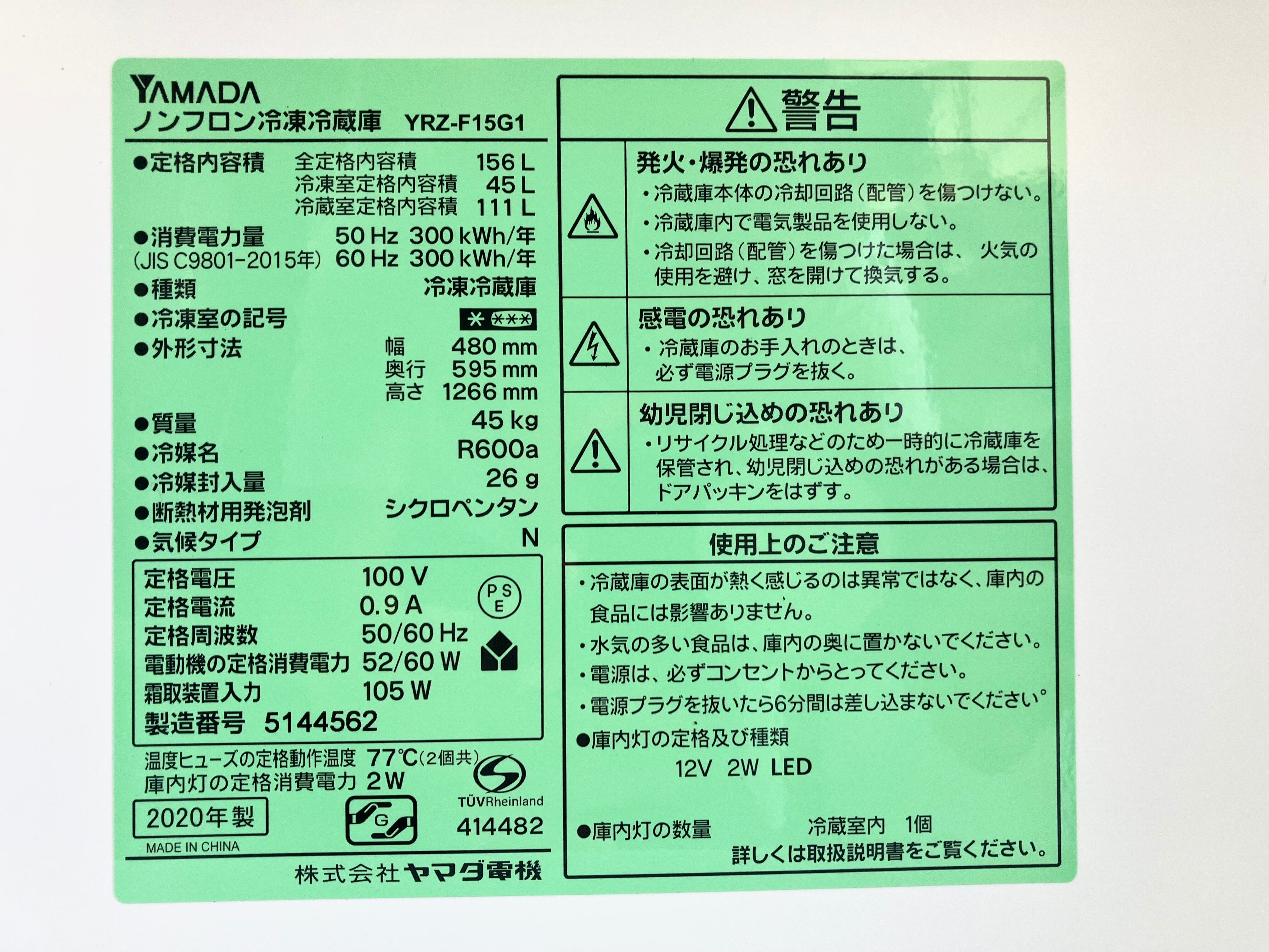 2020年製 YAMADA 156L ノンフロン冷凍冷蔵庫