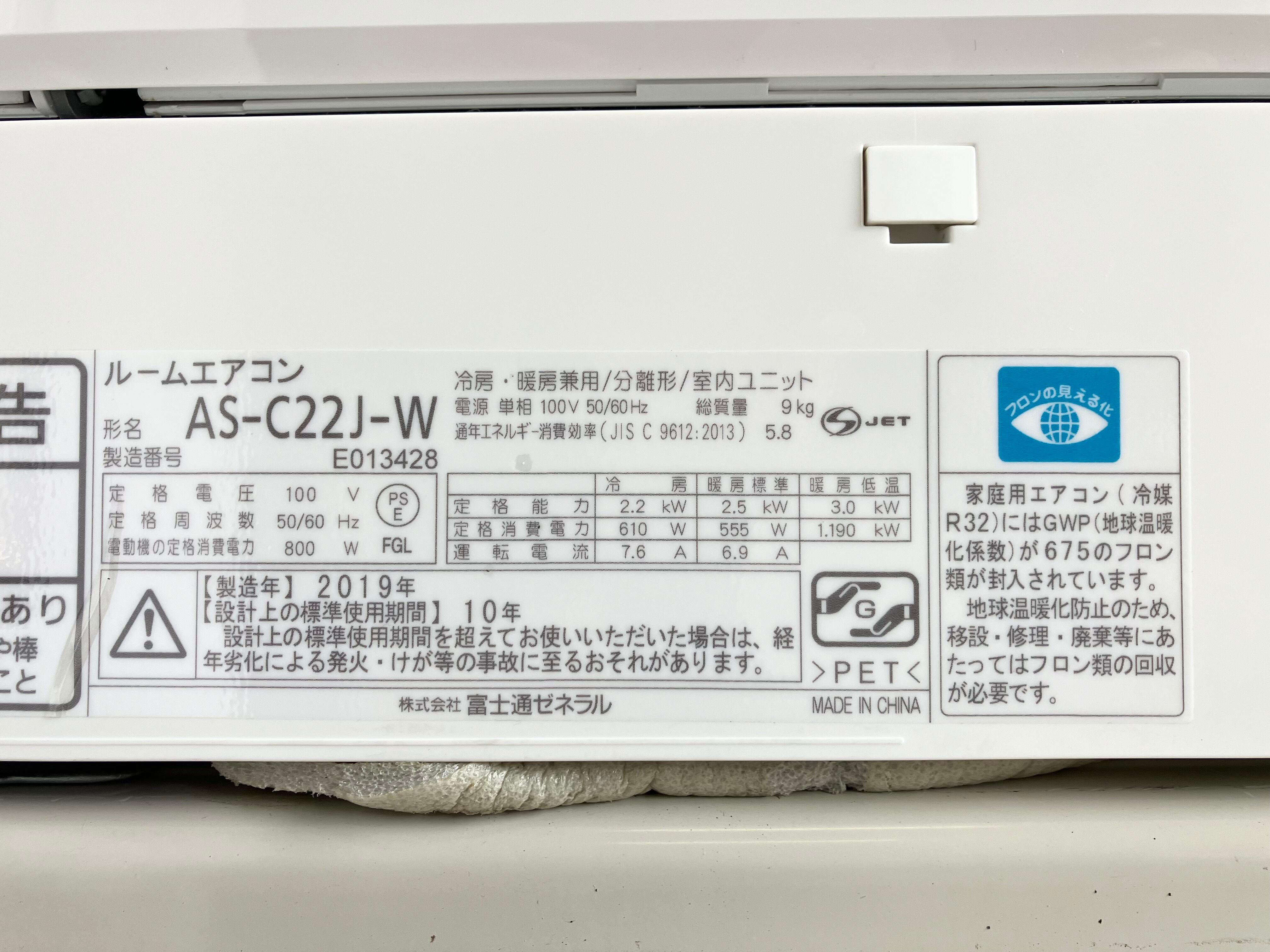 2.2kw-8畳 2019年製 FUJITSU ルームエアコン