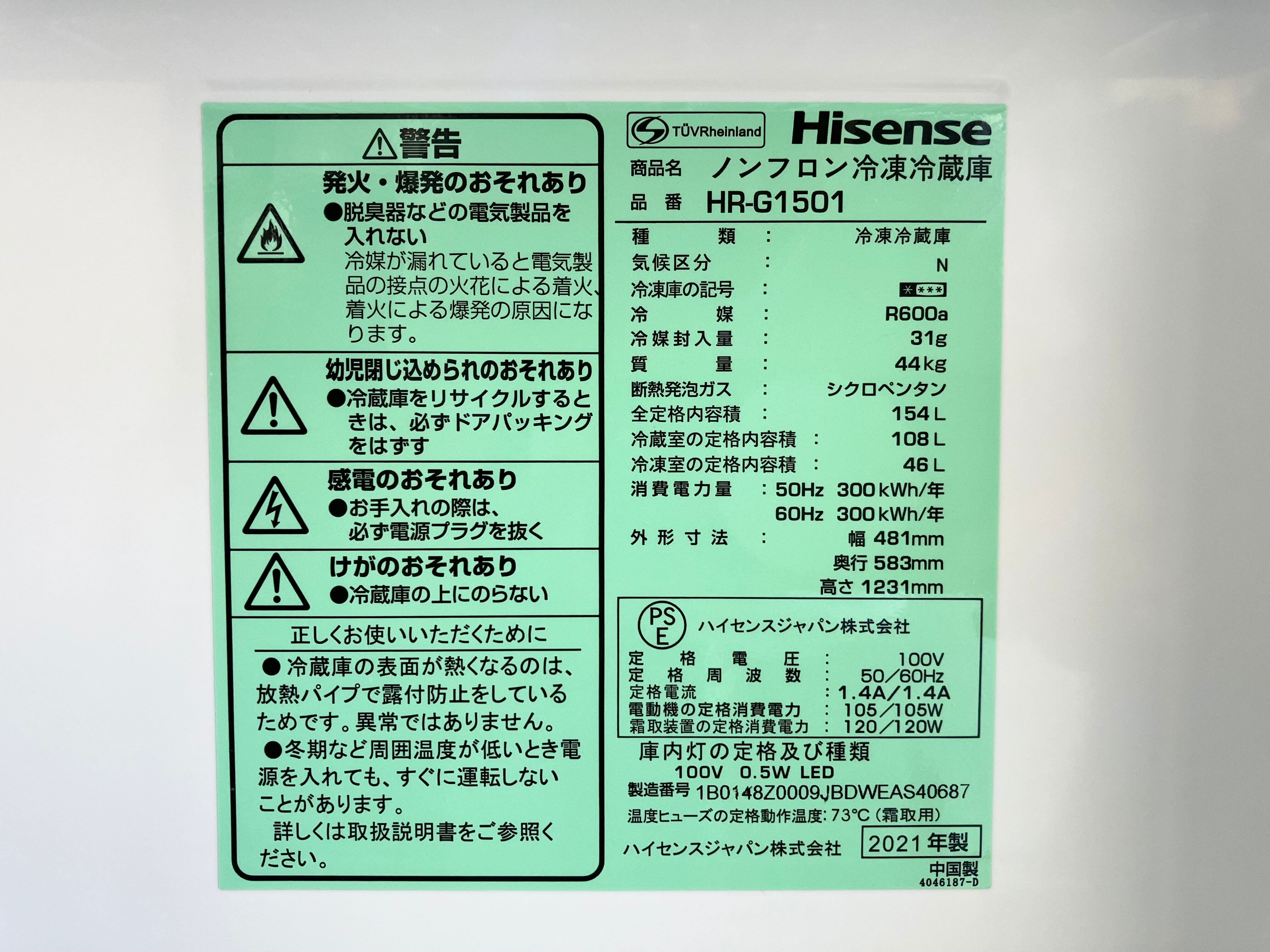 2021年製 Hisense 154L ノンフロン冷凍冷蔵庫