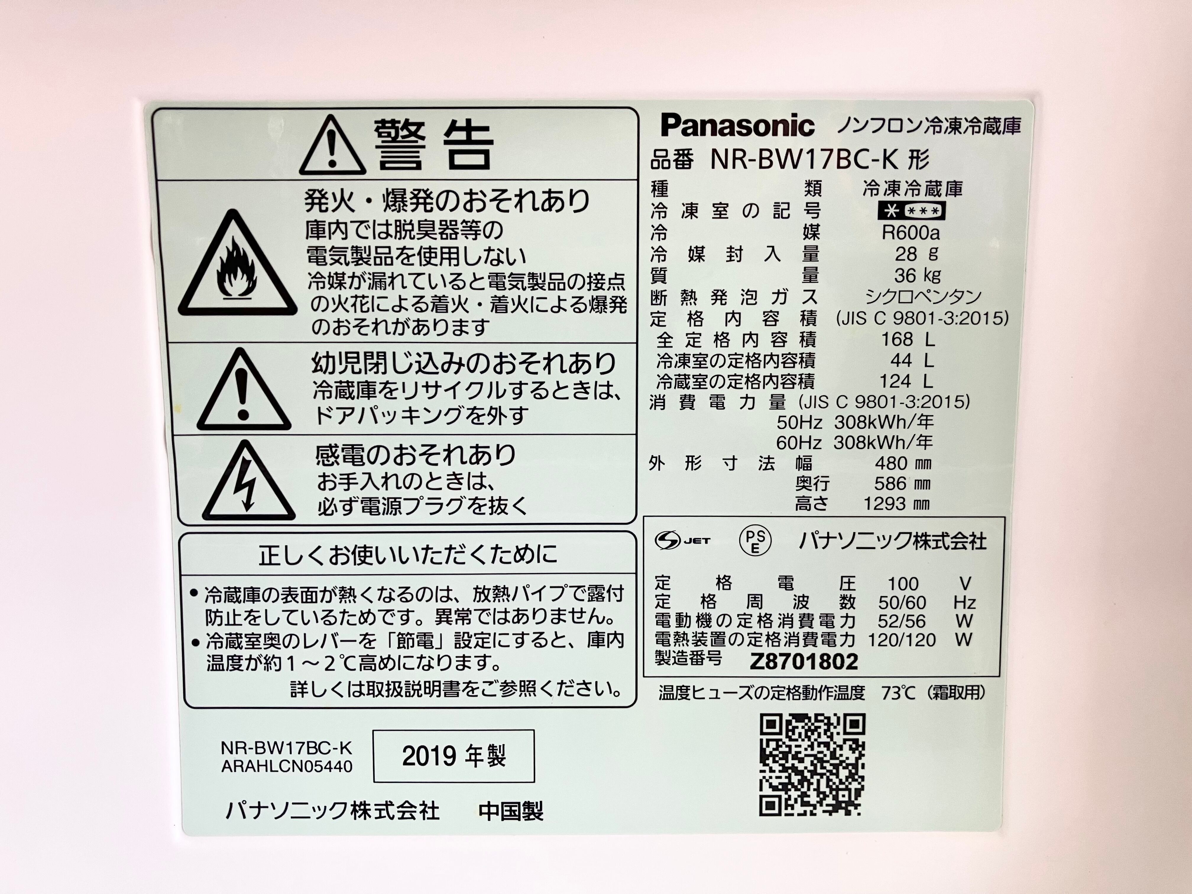 2019年製 Panasonic 168L ノンフロン冷凍冷蔵庫