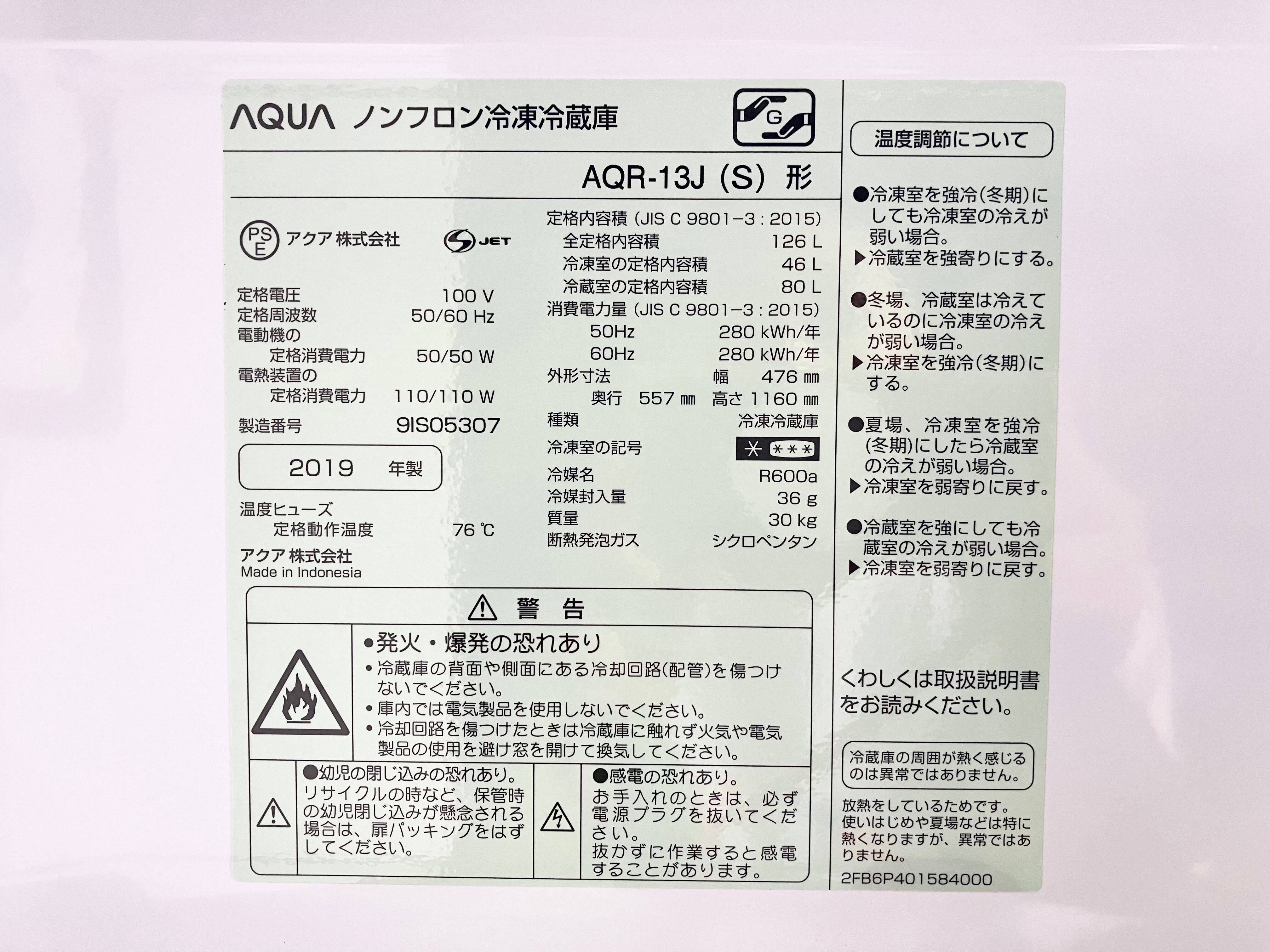 2019年製 AQUA 126L ノンフロン冷凍冷蔵庫