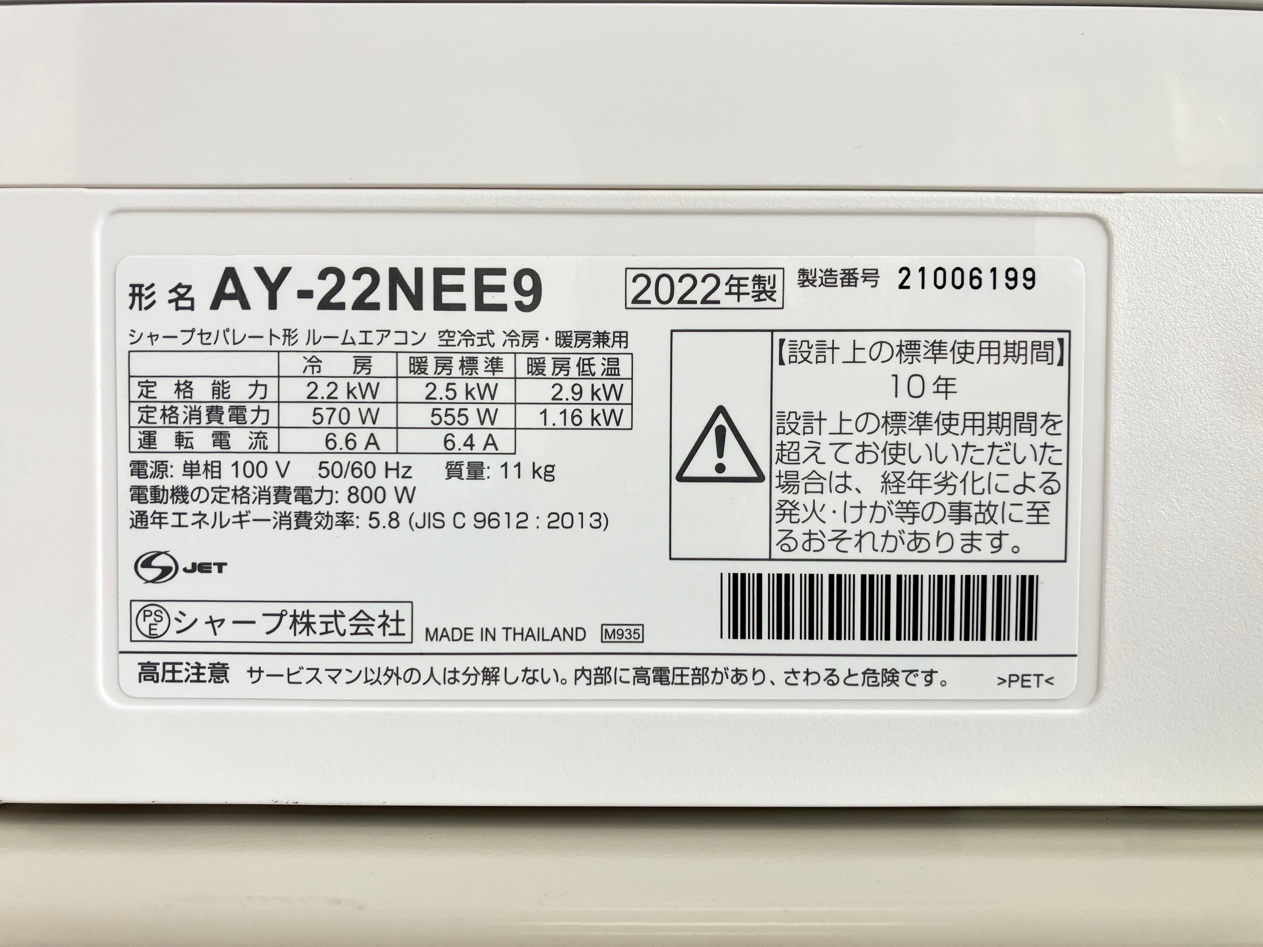 2.2kw-8畳 2022年製 SHARP ルームエアコン