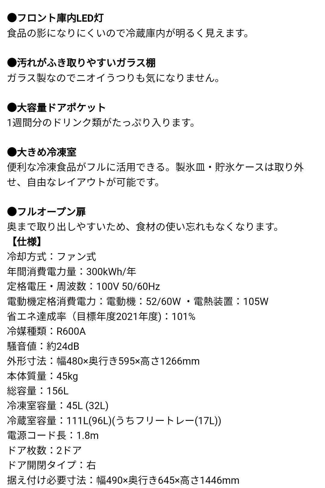 ドリンク類もたっぷり入るドアポケットや大きめの冷凍室など、コンパクトでも大容量でまとめ買いもしやすいです♪