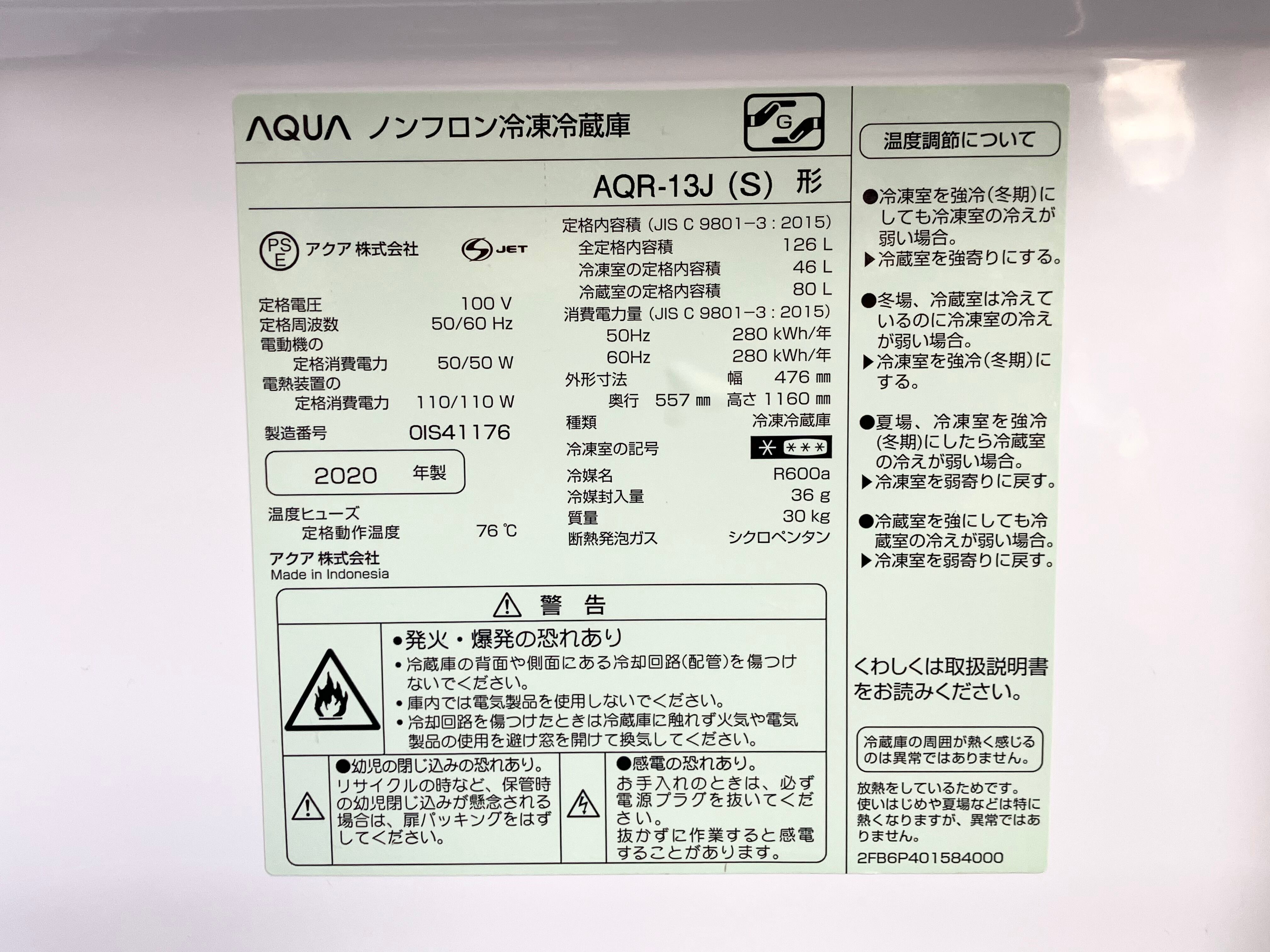 2020年製 AQUA 126L ノンフロン冷凍冷蔵庫